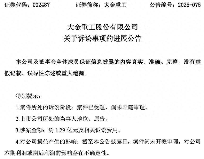 大金重工表示,截至本公告披露日,本案法院已受理尚未开庭。鉴于本次诉讼结果存在不确定性,目前暂不能预计本案对公司本期利润或期后利润的可能影响。公司将依据会计准则的要求和届时的实际情况及时进行相应的会计处理,具体以公司经审计的财务报告为准。