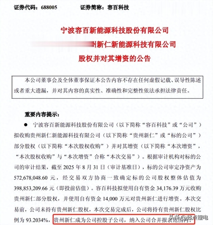 12月12日,容百科技发布公告称,拟使用自有资金3.42亿元收购贵州新仁新能源科技有限公司(以下简称:贵州新仁)54.9688%股份,并使用自有资金1.4亿元对贵州新仁进行增资。